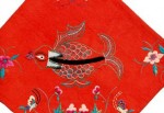 Human life comes from mother ’s body of totem animals, god of propagation. In areas where people worship legendary animals or totem animals like the turtle, the snake, the fish and the frog; and in places where supernatural power becomes personalized in “Baby with coiled hair;” birth presents from the maternal family are pillow case with patterns of a paired fish (yin-yang), or a paired turtles and a paired frogs. There are also embroidery patterns of “Crawling baby with coiled hair” (this is very similar to the design on the porcelain pillow from northern China in Song, Yuan, Ming and Qing dynasties.) It is interesting to note that a diamond shaped symbol like a female uterus is placed in the center among the animals, implying that the new baby comes from mother’s body of legendary animals or god of propagation.